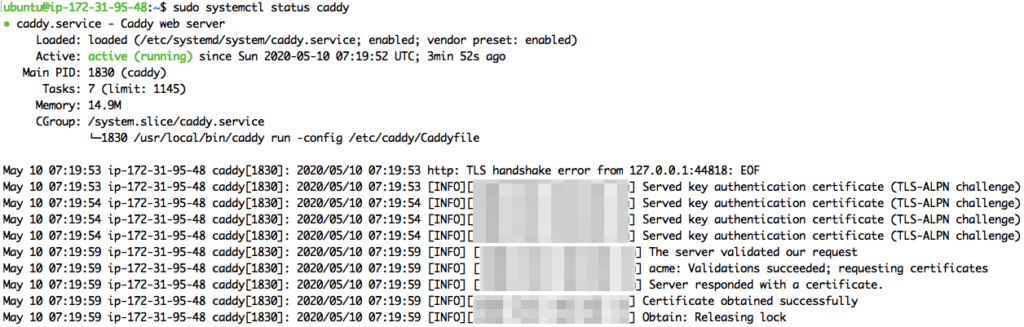If all went well, the “status” command should show output stating that it’s obtained the certificates: